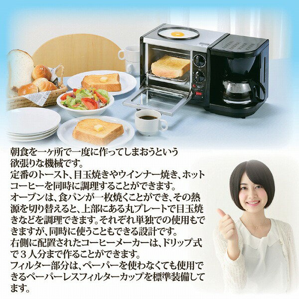 トースト・コーヒー・目玉焼きなどが一度にできる!●コンパクトで一人暮らしの方にもオススメ!●コーヒーは3人分までドリップできる!●朝食を一ヶ所で一度に作ってしまおうという欲張りな機械。