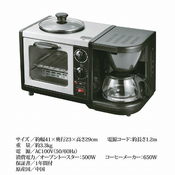 ●サイズ:約幅41×奥行23×高さ29cm●電源コード:約長さ1.2m●重量:約3.3kg●電源:AC100V(50/60Hz)●消費電力:オーブントースター=500W、コーヒーメーカー=650W●保証書:1年間付●中国製※離島は別途送料が掛ります。