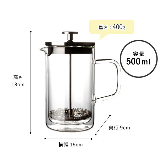 サイズ 約 幅15 × 奥行9 × 高さ18cm 重量 約400g 容量 約500ml 材質 耐熱ガラス 【lump】二重構造 ダブルウォール の コーヒープレス コーヒーメーカー です 。