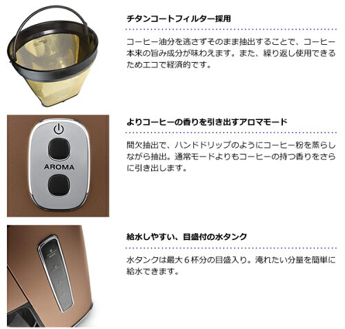 【型式番号】 ICMI011J-CP:スタイルコッパー、 ICMI011J-BZ:ブロンズ、 ICMI011J-BK:ブラック、 ICMI011J-W:ホワイト 【外形寸法】 幅170×奥行230×高さ285mm 【本体質量】 2.2kg 【電源コードの長さ】 1.8m 【電圧/周波数】 AC100V/50/60Hz 【消費電力】 750W 【給水タンク容量】 0.81L 【ジャグ容量】 0.81 【付属品】 計量スプーン 【保証期間】 1年 【生産国】 中国 【JAN】 スタイルコッパー:4988371023766 ブロンズ:4988371023773 ブラック:4988371023780 ホワイト:4988371023797 Delonghi(デロンギ) ディスティンタコレクション ドリップコーヒーメーカー ICMI011J-CP/ICMI011J-BZ/ICMI011J-BK/ICMI011J-W スタイルコッパ/ブロンズ/ブラック/ホワイト 家電 キッチン家電 珈琲 カフェ コーヒーメーカー ドリップコーヒー 広告文責 (有)パルス 048-551-7965 「通常土日祝日を除く1週間以内に出荷の予定ですが万が一欠品やメーカー終了の場合は別途メールにてご連絡いたします」『Delonghi(デロンギ) ディスティンタコレクション ドリップコーヒーメーカー ICMI011J-CP/ICMI011J-BZ/ICMI011J-BK/ICMI011J-W スタイルコッパ/ブロンズ/ブラック/ホワイト』家電 キッチン家電 珈琲 カフェ コーヒーメーカー ドリップコーヒー スクエアクルデザイン、メタリックカラーの控え目な光沢。